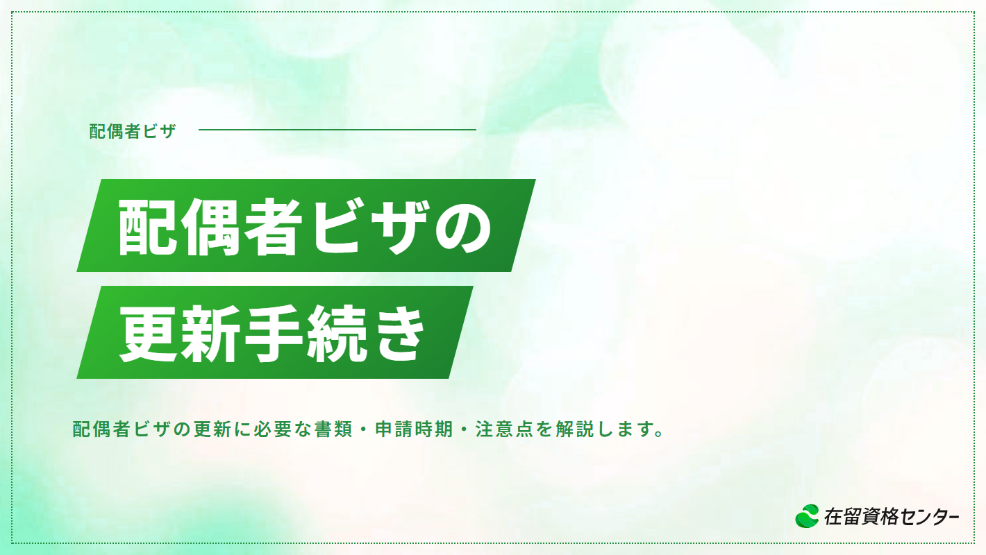 配偶者ビザ(日本人の配偶者等)は、在留期間が満了する前に更新手続きを行わなければ日本に滞在し続けることができません。更新手続き自体は初回申請と比べてシンプルですが、婚姻関係の継続性や世帯の経済状況によっては不許可になるケースもあります。この記事では、配偶者ビザの更新に必要な書類、申請のタイミング、在留期間を延ばすための条件、不許可時の対応まで実務の視点から解説します。