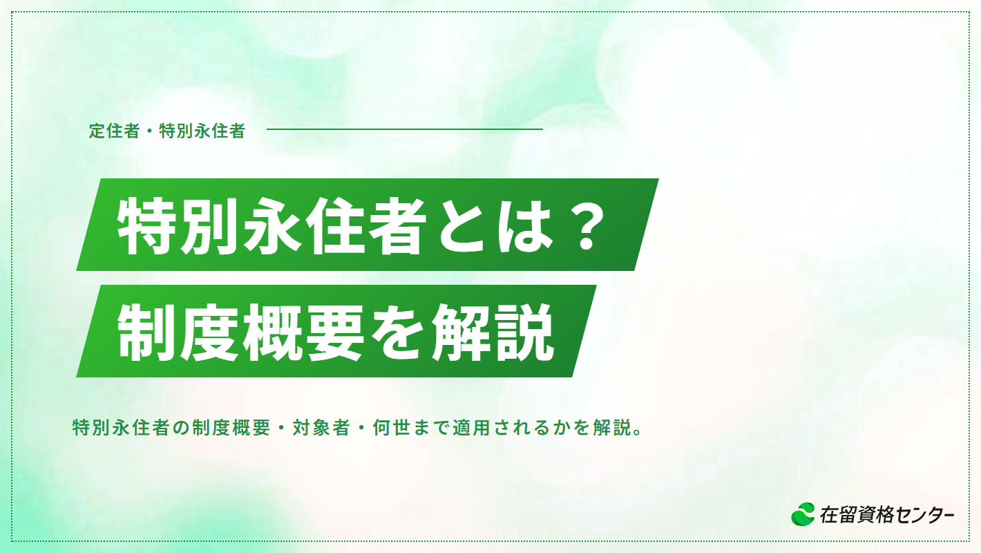 特別永住者とは、「日本国との平和条約に基づき日本の国籍を離脱した者等の出入国管理に関する特例法」(入管特例法)に基づいて、日本での永住が認められた外国人のことです。