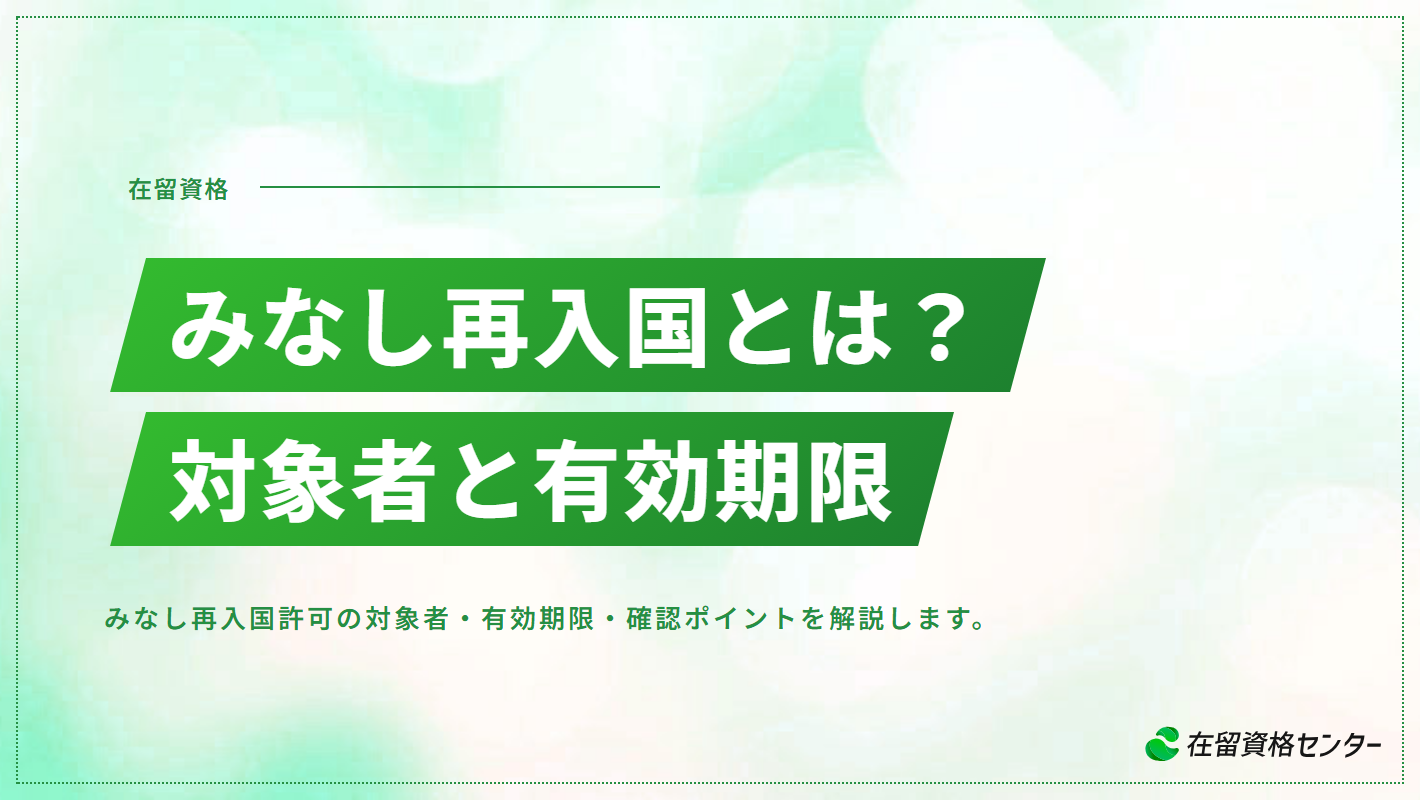 みなし再入国許可とは、有効な旅券(パスポート)と在留カードを所持する外国人が、出国後1年以内に再入国する場合に、事前の再入国許可申請を不要とする制度です。2012年7月の新しい在留管理制度の施行に伴い導入されました。