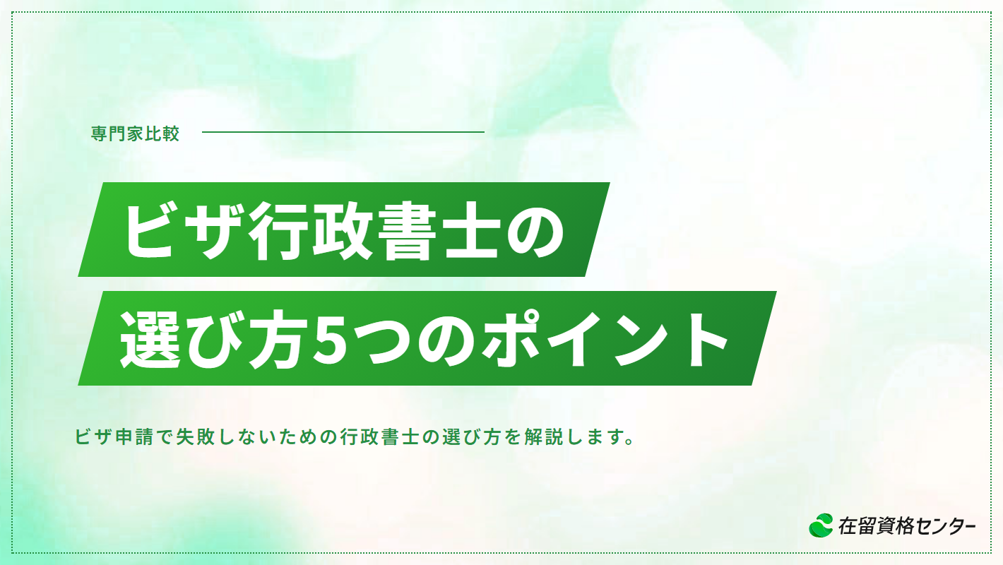 ビザ申請で失敗しないためには、「申請取次の届出」「入管業務の実績」「料金の透明性」「専門分野の一致」「不許可時のフォロー体制」の5つのポイントを押さえて行政書士を選ぶことが重要です。行政書士の選び方ひとつで、許可の可能性も手続きの負担も大きく変わります。