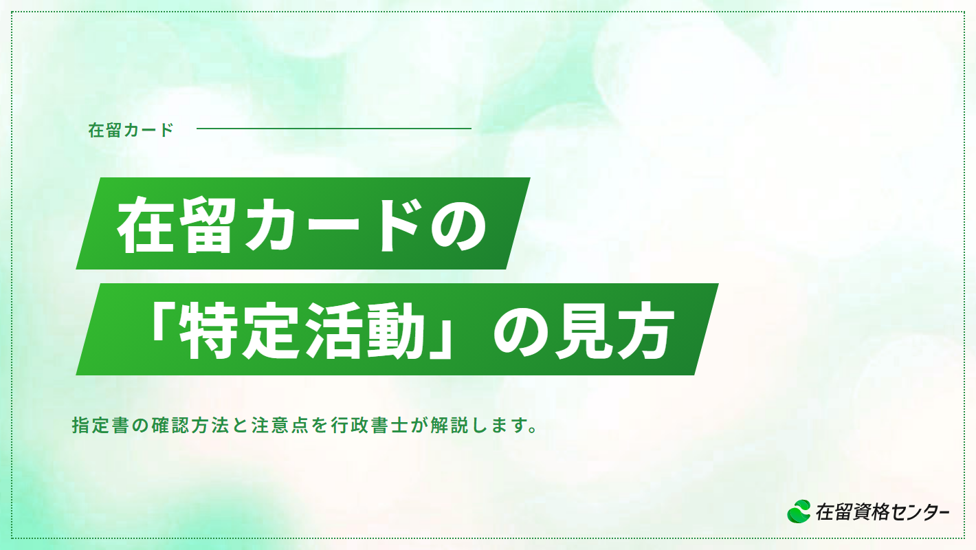 在留カードの在留資格欄に「特定活動」と記載されている場合、その外国人がどのような活動を許可されているかは在留カードだけでは判断できません。特定活動は、法務大臣が個別に活動内容を指定する在留資格であり、具体的な就労範囲はパスポートに貼付された「指定書」を確認する必要があります。この記事では、特定活動の仕組み、指定書の見方、代表的な類型、企業が雇用時に注意すべきポイントまで、実務に即して解説します。