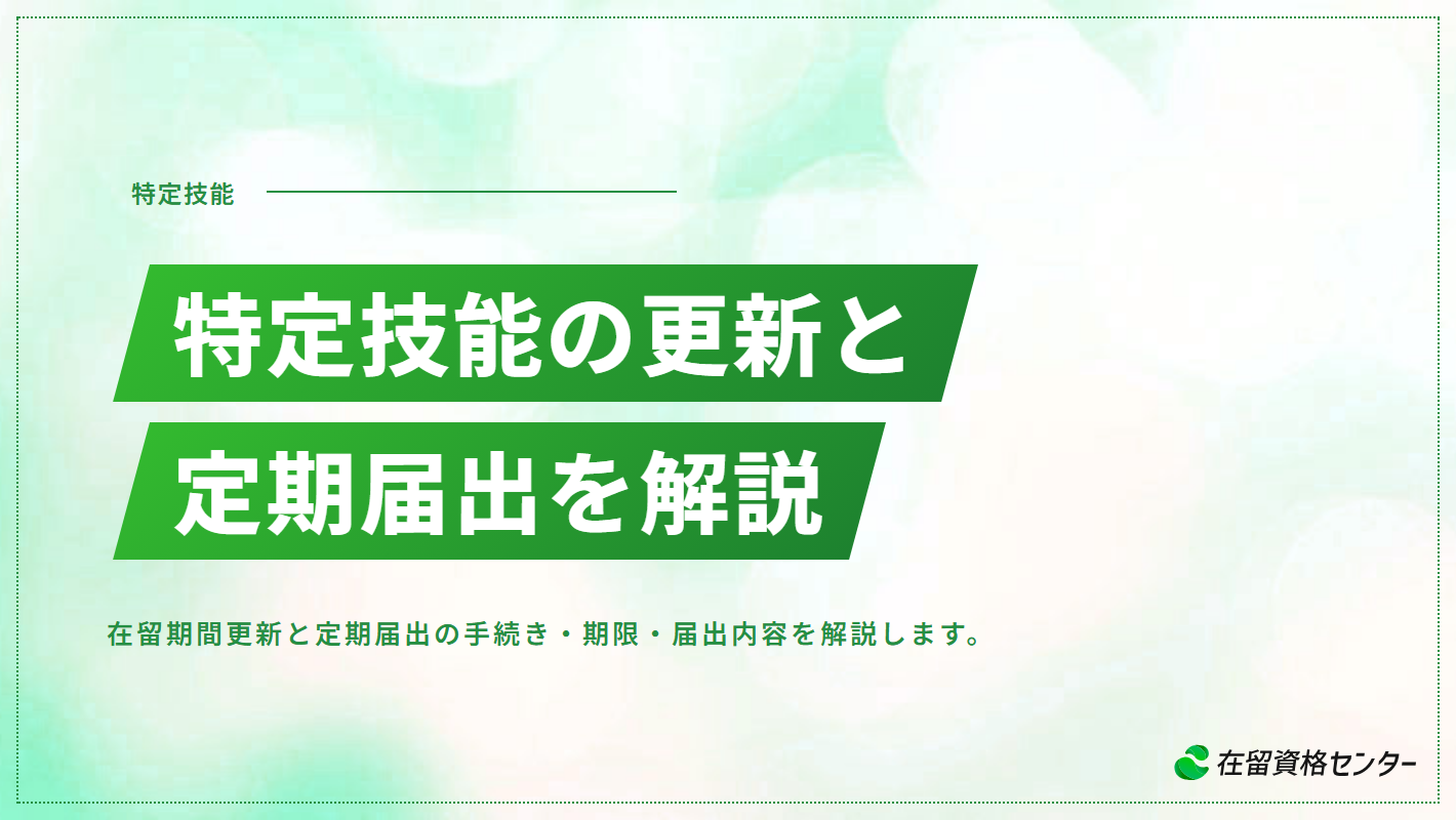 特定技能の在留資格は、一度取得すれば終わりではありません。在留期間の更新申請と、受入れ企業に課される定期届出の両方を継続的に行う必要があります。更新申請は外国人本人の在留資格を維持するための手続きであり、定期届出は受入れ企業(特定技能所属機関)が入管に対して活動状況を報告する義務です。この二つは制度上まったく別の手続きですが、実務上はどちらか一方を怠るだけで在留資格の取消しや受入れ停止といった重大な結果につながります。この記事では、特定技能の在留期間更新と定期届出について、必要書類・期限・届出内容・よくあるミスまで実務目線で解説します。