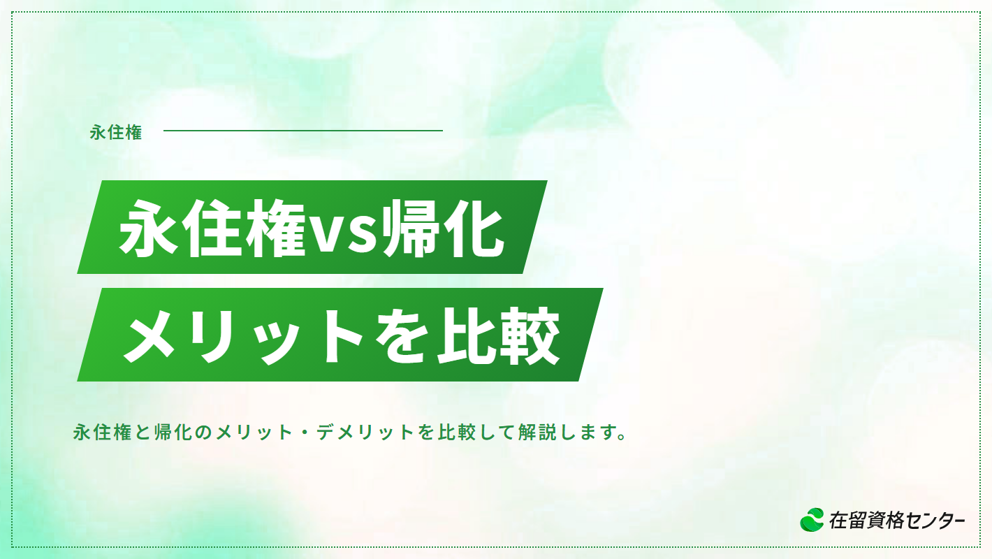 永住権は「外国籍のまま日本に無期限で在留できる資格」であり、帰化は「外国籍を離脱して日本国籍を取得すること」です。ここが両者の決定的な分岐点になります。
